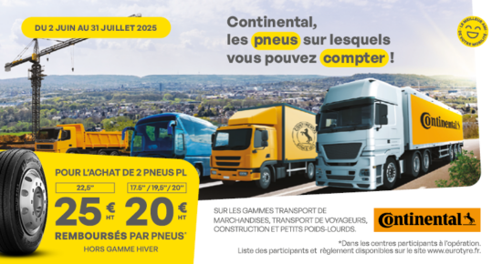 Du 2 juin au 31 juillet 2025, pour l’achat de 2 pneus poids lourds Continental, profitez de 25€ HT remboursés […]